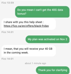I activated my account on November 2nd (Pacific Time, BC). A Fizz agent assured me the bonus was coming a few weeks ago, but I still haven’t received anything. This is quite disappointing.