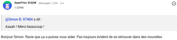 Hier j'ai utiliser le forum pour poser une question et j'ai reçu plusieurs réponses (un gros merci !) Est-ce possible de "répondre" à une réponse ? Ça ne semble pas être possible, je ne vois aucune option.