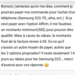 Si tu ne passes pas avec Affirm, il faut alors une autre carte de crédit ou utiliser le même mode de paiement que ton forfait mensuel mais ça ne sera pas un montant mensuel sur 12, 24 mois etc mais le montant total immédiatement