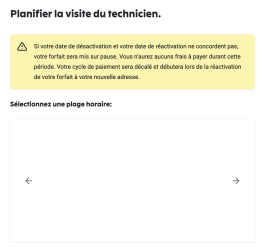 Je veux déménager ma ligne internet à une nouvelle adresse, mais il est impossible de réserver une plage horaire. La page est vide. Un ticket a déjà été ouvert par un préposé qui dit :